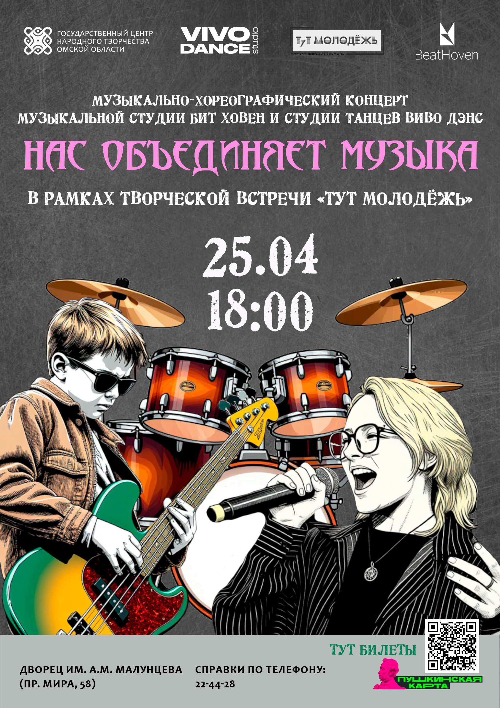 25 апреля в ДК Малунцева (пр. Мира, 58) — праздник творчества! Студия «BeatHoven» и студия танца «Vivo Dance» представят большой совместный концерт «Тут молодёжь» при поддержке Государственного Центра Народного Творчества Омской области. Живая музыка, зажигательные танцы и юные таланты, для которых искусство — это жизнь. Зрителей ждёт вечер искренних эмоций, красоты и вдохновения. Не пропустите!