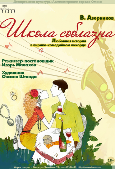 В 18:30 в «Студии» Любови Ермолаевой (Химиков, 27) — лирическая комедия «Школа соблазна». История о непростых взаимоотношениях мужчины и женщины , максимально наполненная юмором и иронией, рассказывающая о переходе романа в брак. Телефон кассы — 67-36-81.
