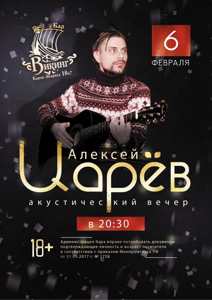 В 20:30 в фолк-баре «Викинг» (пр. К. Маркса, 18/1) выступит омский музыкант Алексей Царев с акустической программой. В этот вечер прозвучат все ваши любимые песни из уст Алексея! Слушаем и подпеваем! Вход свободный.